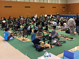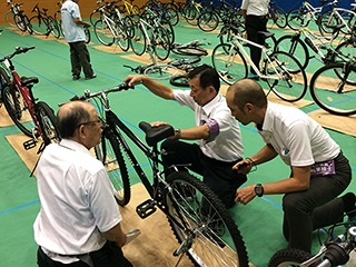 千葉県自転車組合 千葉支部の組合員様が、大会の準備のため自転車の整備をする。